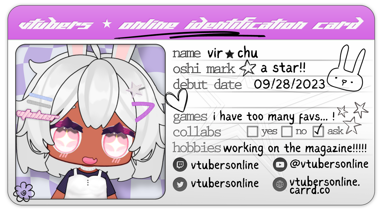 the magazine is hosted on our twitter for now and we plan to drop an issue near the middle or end of the month, every month! issues will cover everything from indie vtubers to look out for to events to look forward to